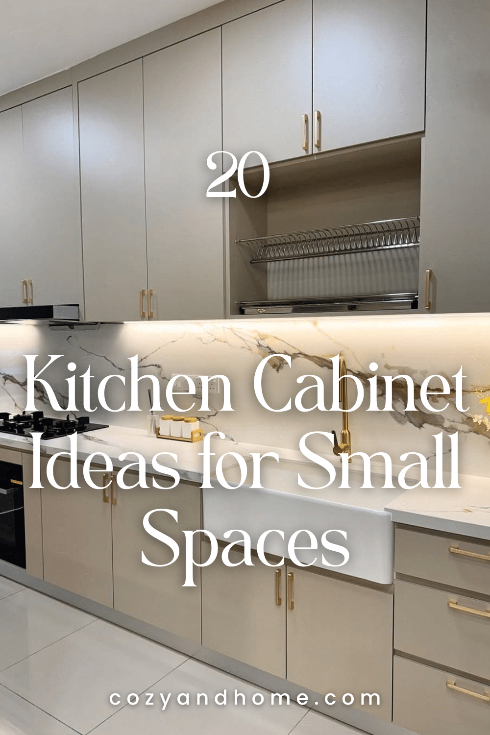 Neutral beige cabinets are paired with a striking marble backsplash featuring bold veining. The gold faucet and hardware add luxury, while the overall look remains clean and contemporary.