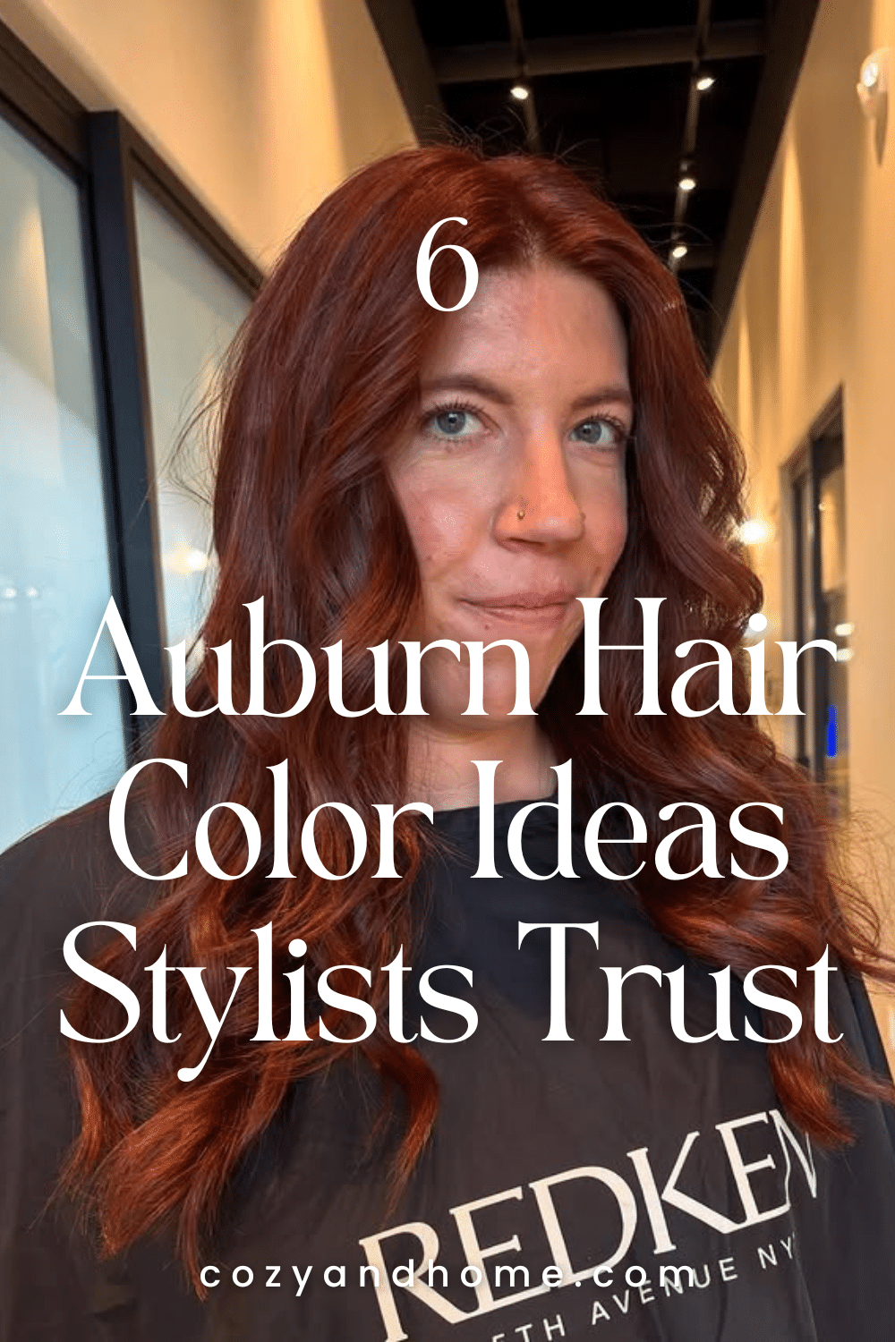 A shoulder-length cut finished with soft waves complements a balanced auburn tone that sits between red and brown. The result is polished, wearable, and ideal for low-maintenance clients.