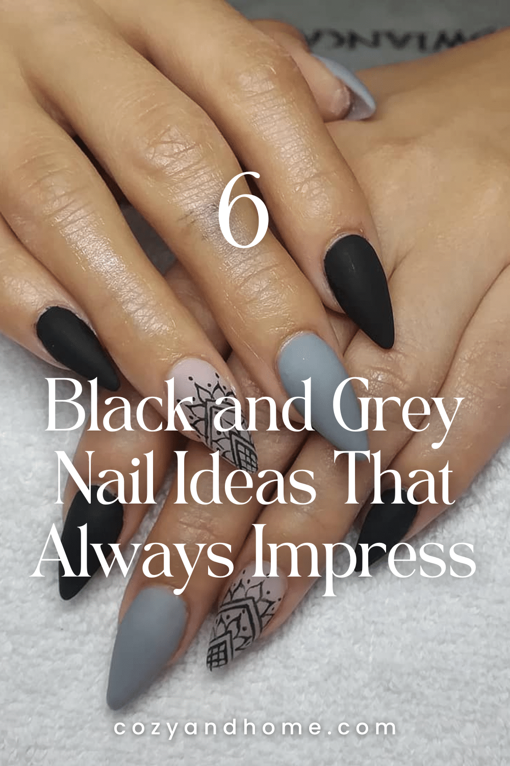 A combination of matte black and matte grey stilettos, softened with a nude accent nail featuring delicate mandala-inspired line art. This design blends bold contrasts with intricate detailing for a balanced finish.