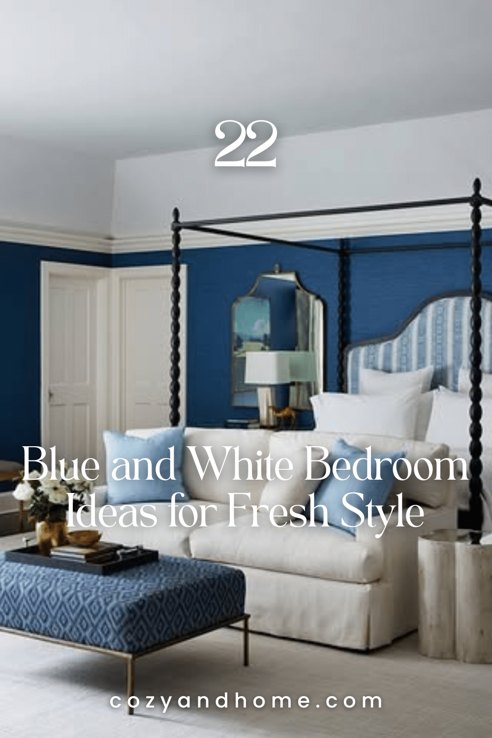 A fresh mix of deep blue bedding, layered pillows, and crisp white linens creates a clean and uplifting bedroom look. Dark window frames and soft artwork add balance, while natural light highlights the easy blend of comfort and tailored style.