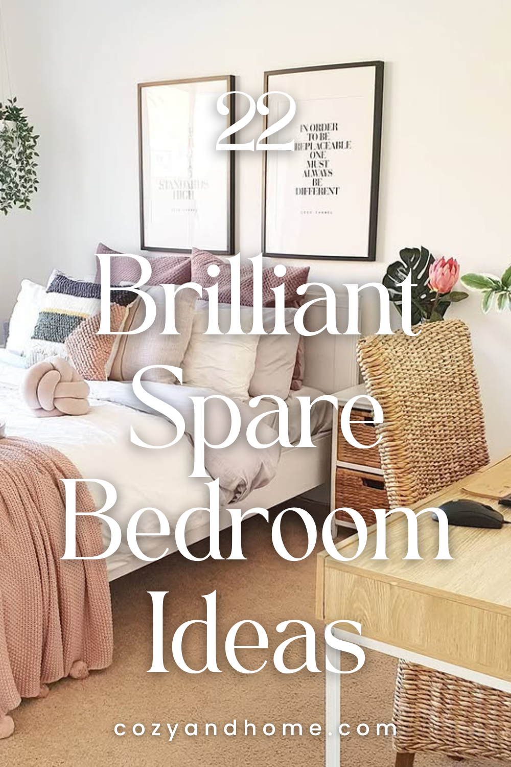 Soft blush throws and cushions warm up a predominantly white scheme, creating a welcoming and feminine aesthetic. Woven storage baskets and a rattan chair introduce texture and function, especially helpful in a spare room that doubles as a workspace. Framed typography art keeps the styling clean and current without overpowering the soft color story.
