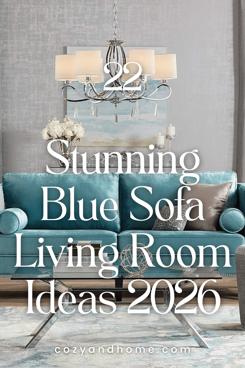 A teal-blue sofa is framed by matching side tables and lamps for a polished, symmetrical arrangement. Silver finishes and soft textiles contribute to a sophisticated, well-coordinated space.