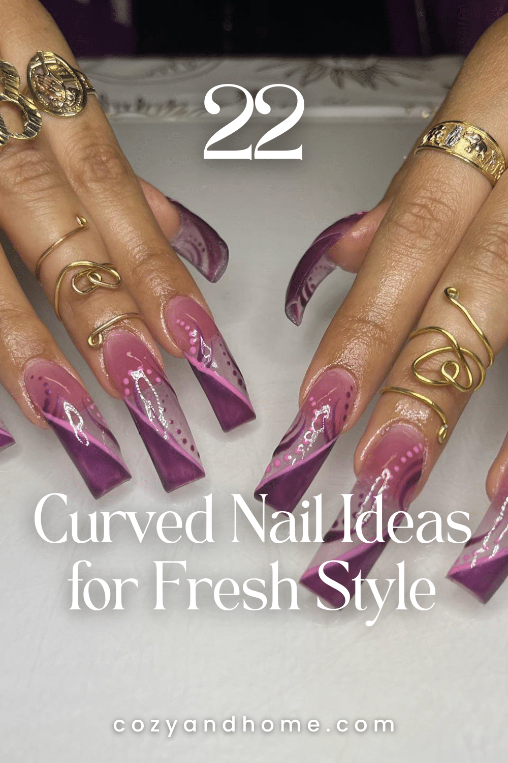 Gradient tones of lilac and plum create sweeping curve tips with airbrushed transitions. The layered detailing and subtle dots along the edges give the nails a polished, artistic flow that enhances the overall shape.