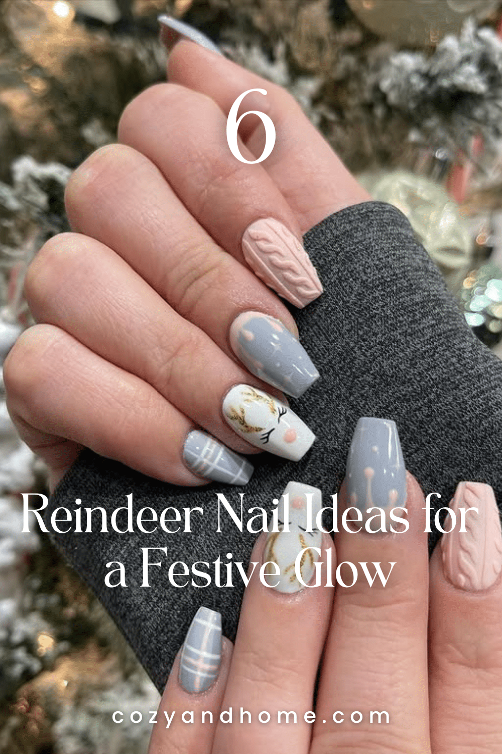 A cozy combination of soft grays, blush tones, and creamy whites inspired by winter sweaters. The matte knit texture and delicate golden reindeer add warmth and sophistication for the colder months.