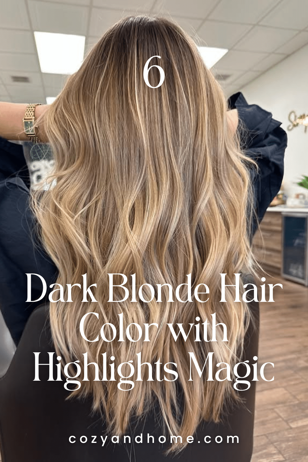 Long, flowing waves create a smooth, glossy finish that enhances the dark blonde base. The highlights are placed with precision to brighten the mid-lengths and ends while keeping the roots softly shadowed for a natural, luminous effect.