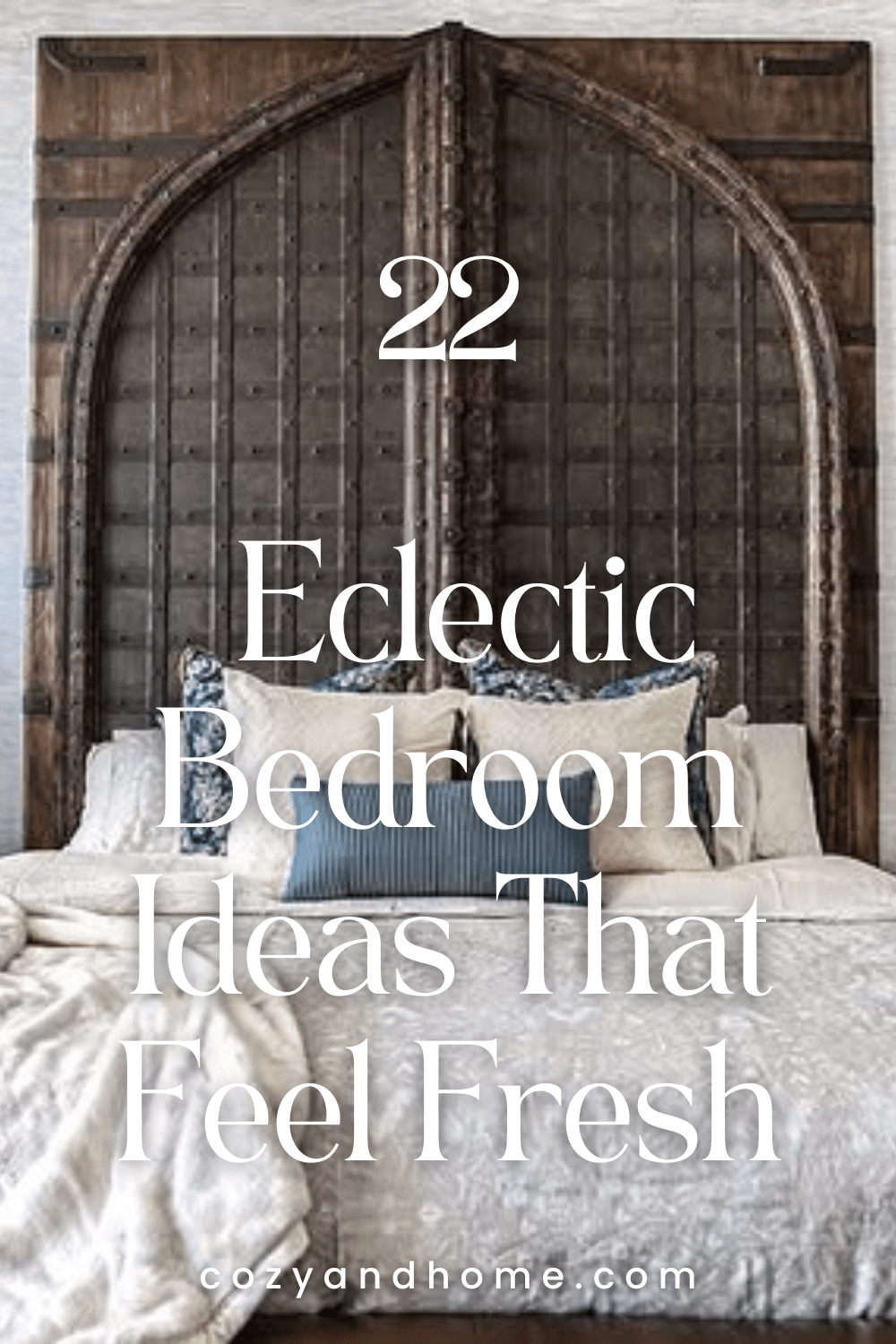 A dramatic wooden headboard anchors this bedroom, bringing texture and architectural presence. Soft neutral bedding balances the bold feature, while symmetrical nightstands and lighting create structure. Subtle pattern mixing in pillows and throws adds dimension without distracting from the focal point.