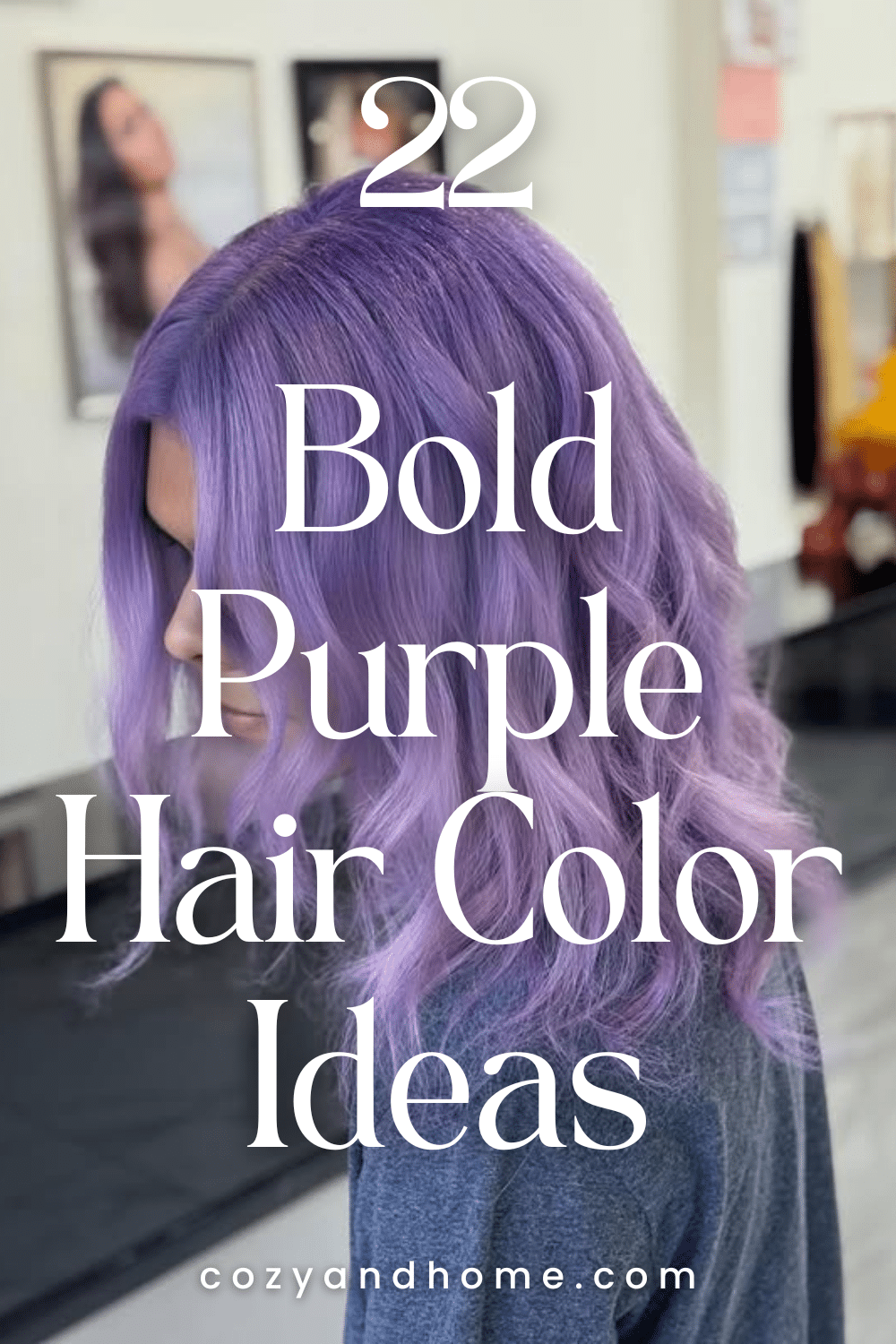 Soft, shoulder-length waves are infused with a smoky mauve violet that blends subtle depth at the crown into richer purple through the ends. The loose styling enhances dimension, giving the color a velvety, multi-tonal finish with natural movement.