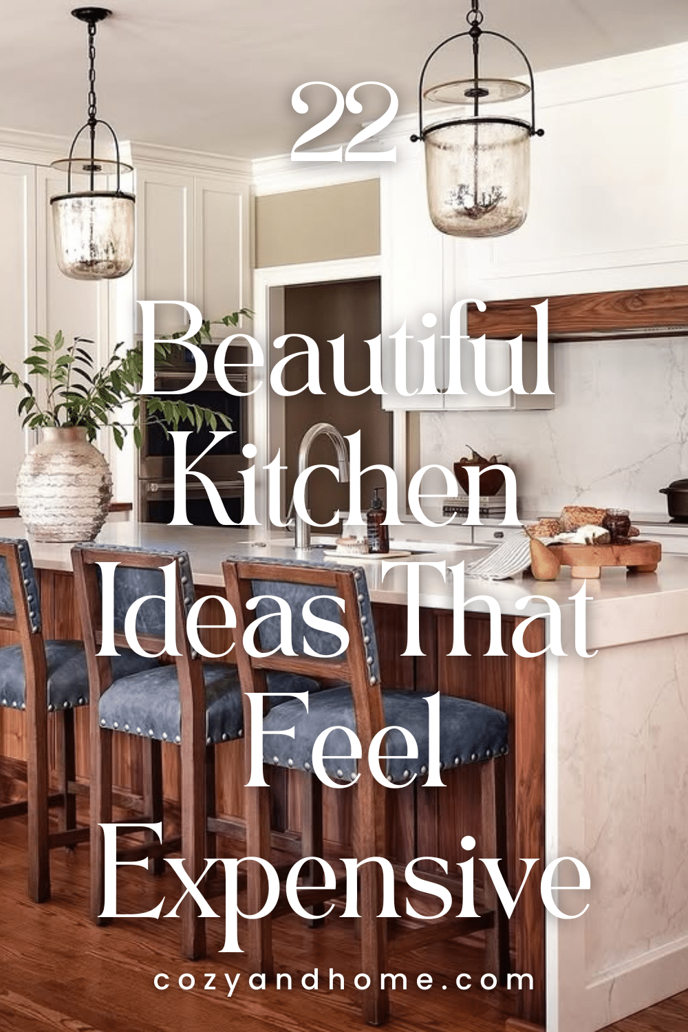 This kitchen blends painted cabinetry with natural wood accents for a balanced, transitional style. Lantern-style pendants and tailored barstools add character, while marble countertops keep the space light and polished.