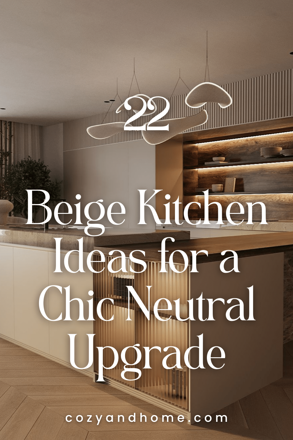 8. Sculptural Beige Kitchen with Layered Wood and Ambient Lighting