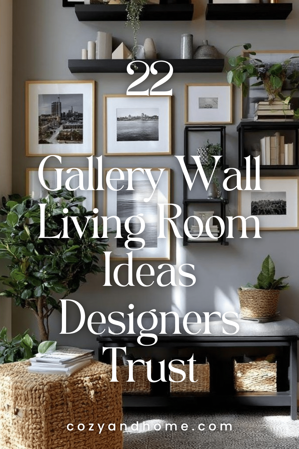 7. Modern Shelf-Integrated Gallery Wall in Gray and Black
