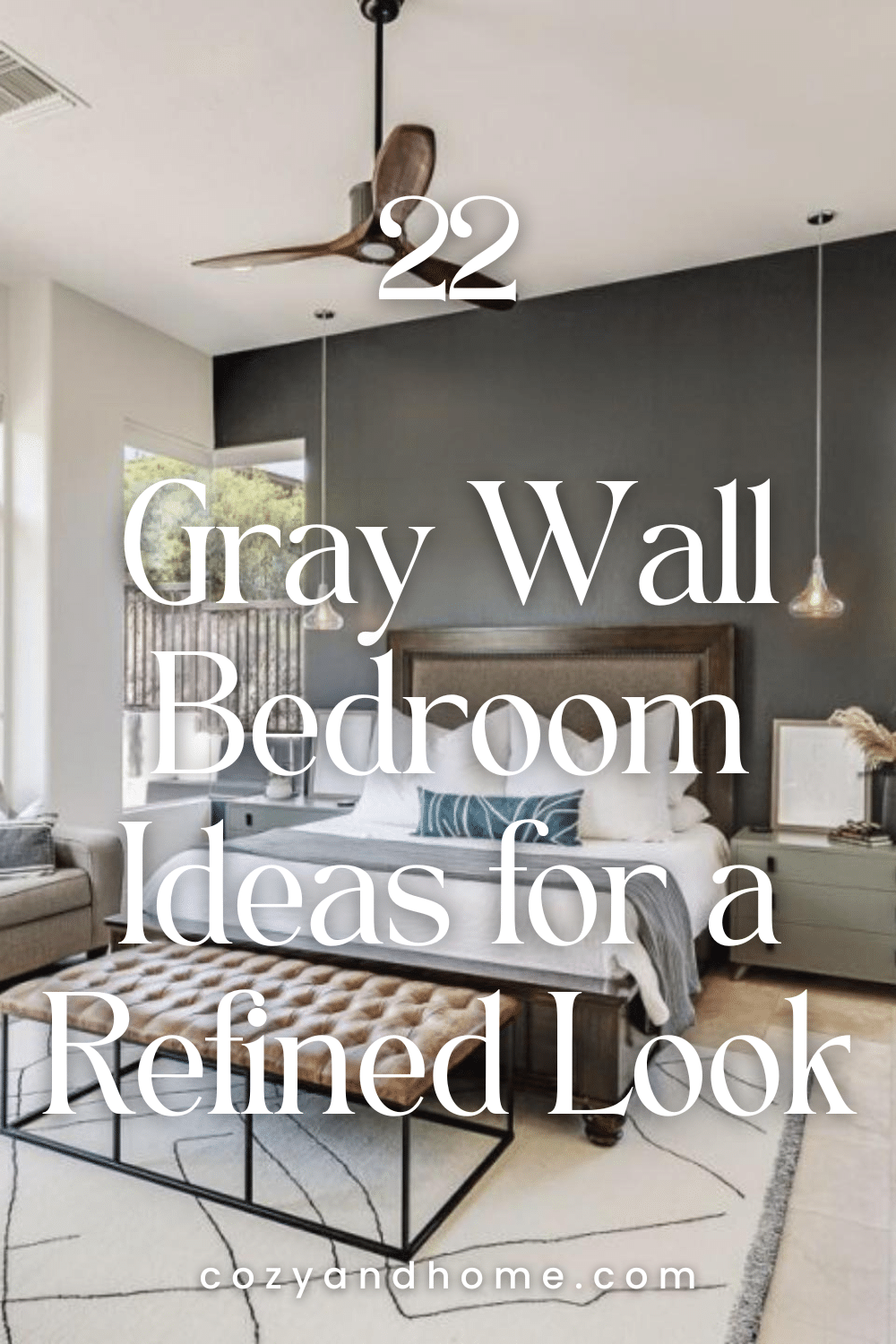 Vertical gray panels framed by rich wood tones deliver a refined, tailored aesthetic. Clean-lined furniture and controlled lighting give this bedroom a high-end hotel feel suited for everyday comfort.