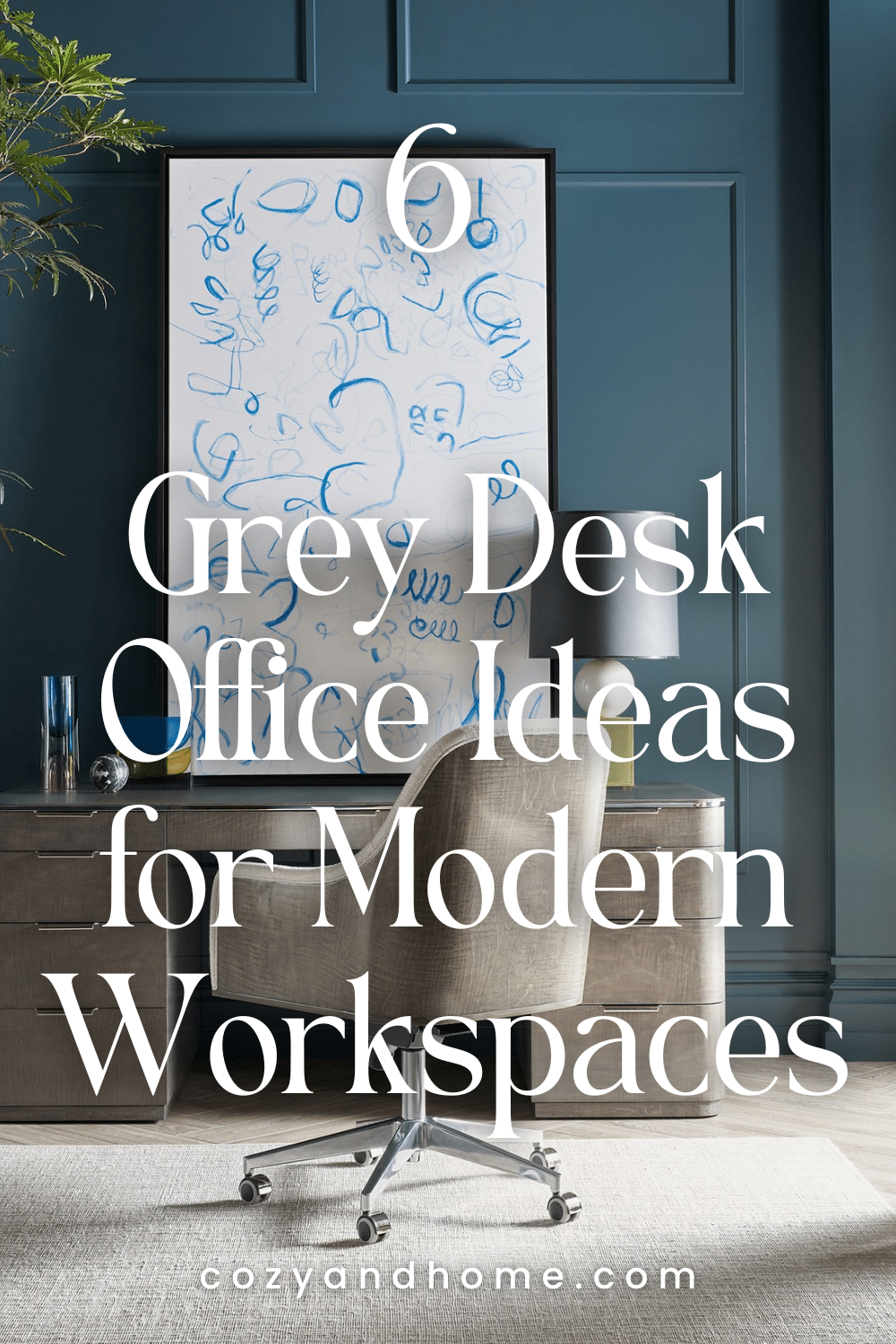 A softly textured grey desk paired with a plush modern chair sets a refined tone in this workspace. The deep blue wall paneling enhances the warmth of the grey furniture, while the simple accessories—a sculptural lamp and curated accents—keep the overall look modern and uncluttered.
