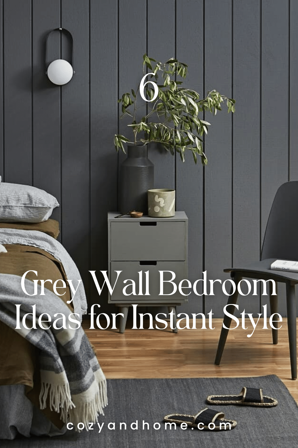 Deep graphite paneling creates a confident backdrop that highlights the layered neutral bedding and soft olive-brown tones. The compact grey nightstand and modern chair keep the layout clean, while the charcoal rug grounds the room. A simple wall sconce and leafy branches introduce subtle organic warmth that pairs beautifully with the structured wall finish.