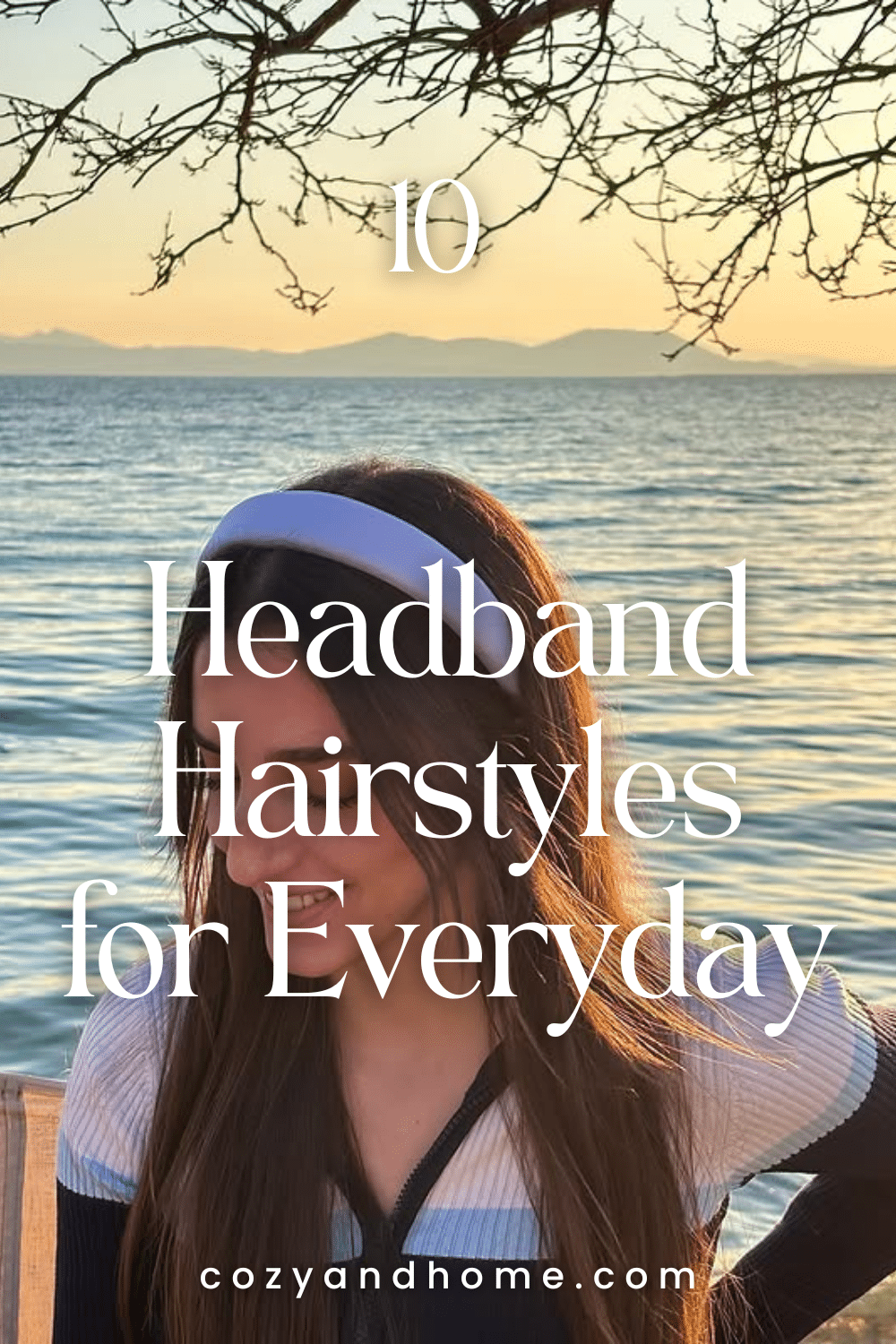 Medium-length brunette hair carries natural texture, paired with a black-and-white striped knot headband. The accessory lifts the look with subtle pattern detail, offering everyday ease with a touch of charm.