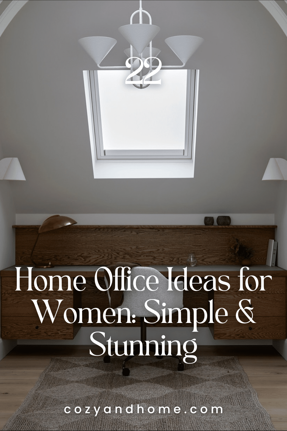A charming office tucked under a skylight, highlighting warm oak cabinetry and a comfortable textured rug. The simple layout, soft lighting, and grounded palette make it perfect for women who prefer a peaceful corner designed for writing, planning, or deep work.