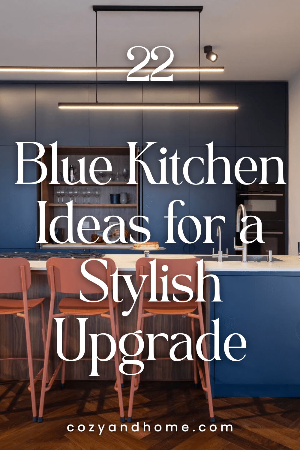 Sleek, handleless blue cabinetry delivers a seamless look, enhanced by linear lighting that highlights clean lines. The combination of wood accents and subtle open shelving adds texture without disrupting the minimalist approach.