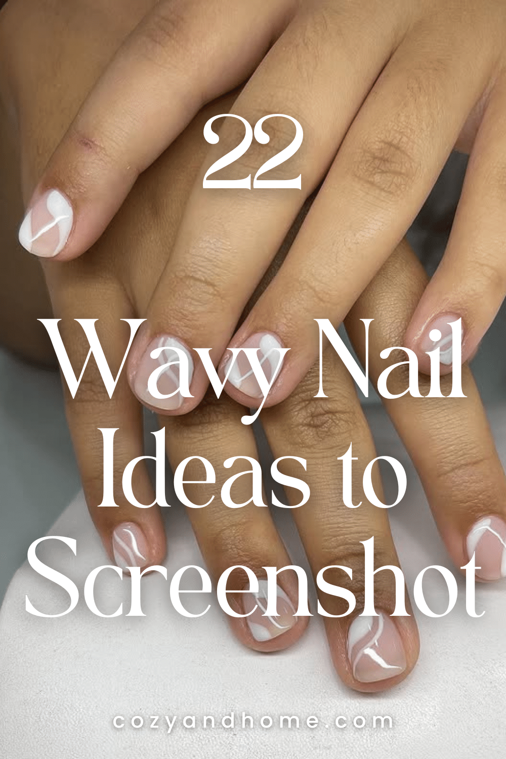 Natural short nails are finished with fine white wavy lines on a translucent pink base. The minimal detailing offers a clean, modern look suitable for subtle nail styling.