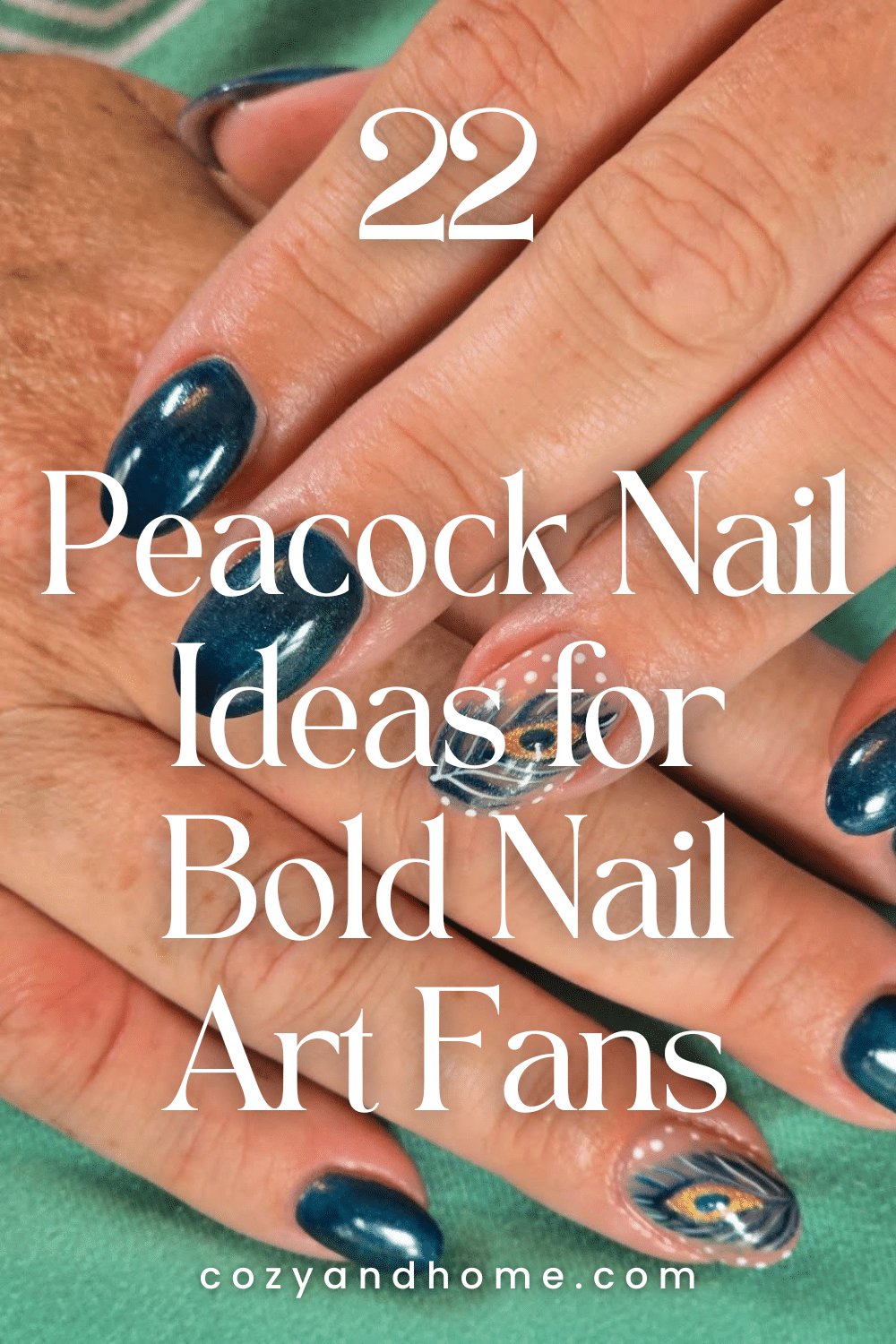 Dark blue and teal tones form a dramatic base for feather-inspired accent nails. Subtle pattern work and metallic finishes enhance the peacock theme while keeping the overall look sleek and cohesive.