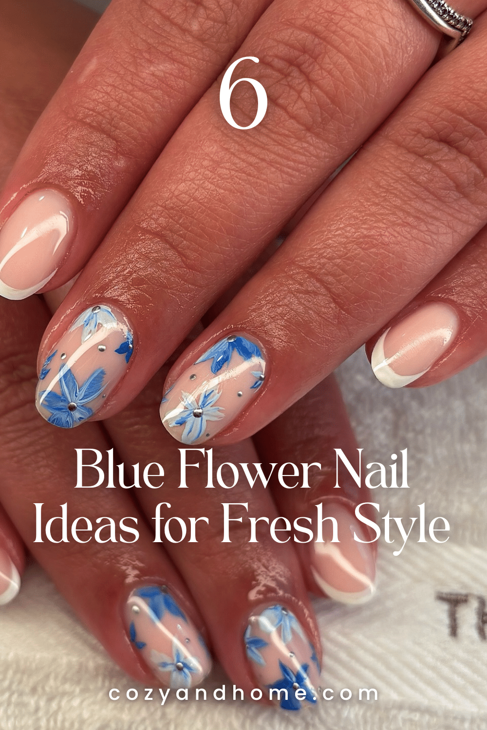 1. Soft Nude Nails with Bold Blue Blossoms