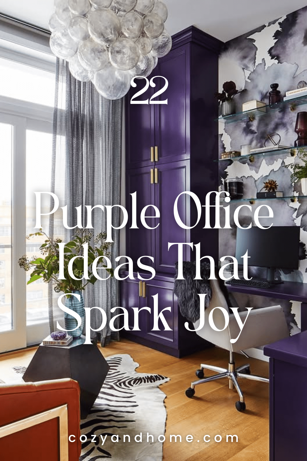 This sophisticated office features rich, glossy purple cabinetry paired with a watercolor-inspired feature wall. Brass hardware adds a refined touch, while layered textures like the faux fur throw and patterned rug create a sense of depth. The design is bold yet polished, perfect for a modern professional.