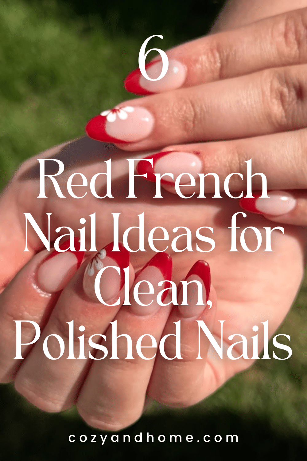 This manicure combines red French tips with delicate white floral detailing for a feminine finish. The added nail art introduces softness and charm, making it a beautiful option for spring events, bridal looks, or romantic styling.