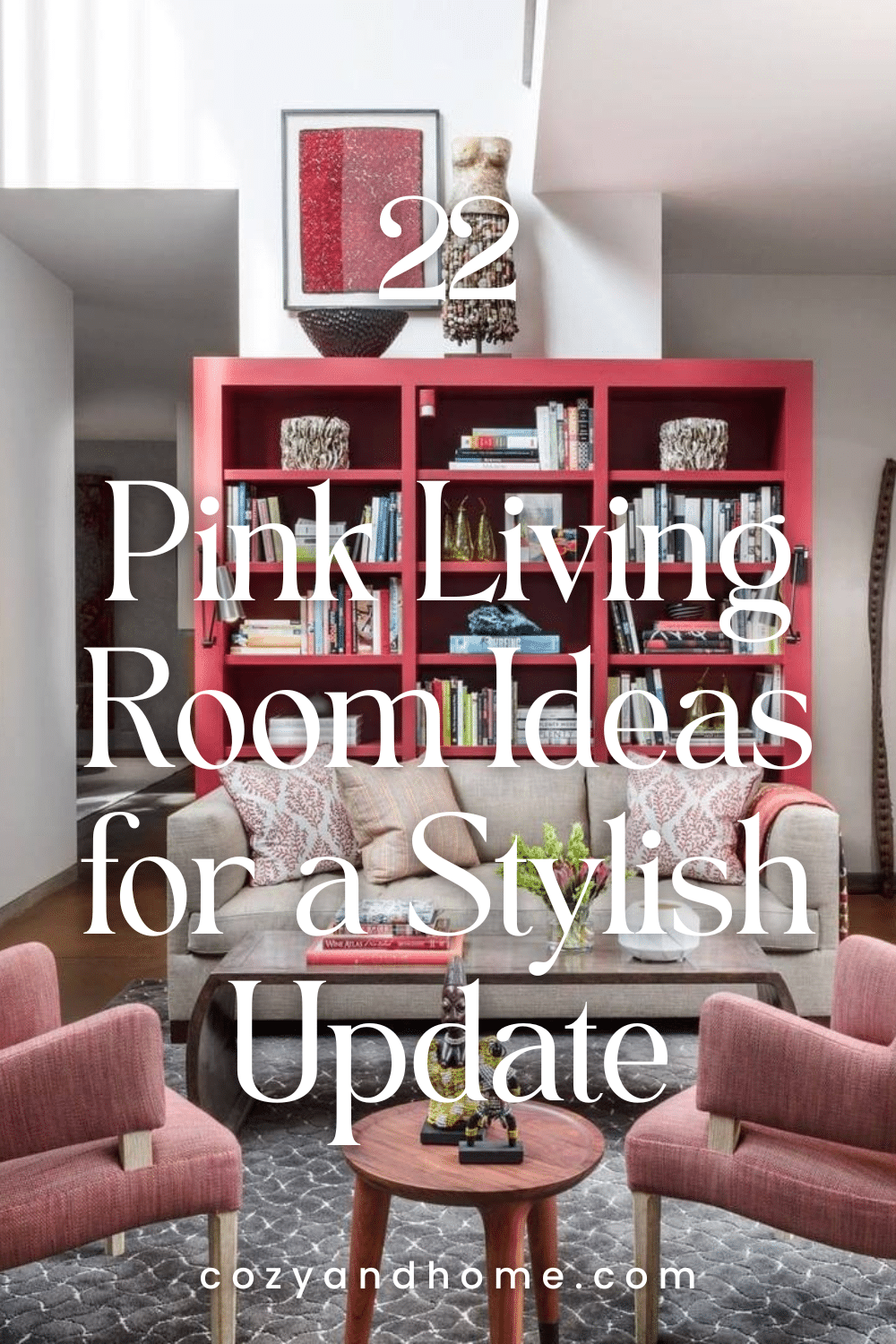 Bold shelving and structured seating introduce depth against pink walls, resulting in a confident and modern interior. Thoughtful placement of books and objects adds visual interest while keeping the room organized and intentional.
