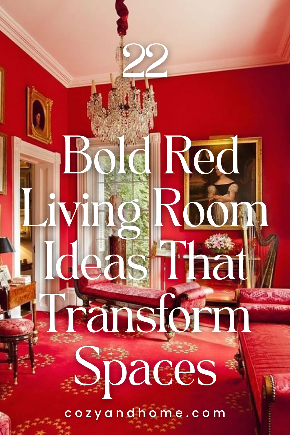 Ornate furnishings, rich red walls, and a statement chandelier define a formal and timeless aesthetic. Gold accents and classic artwork elevate the room with a sense of heritage and sophistication.