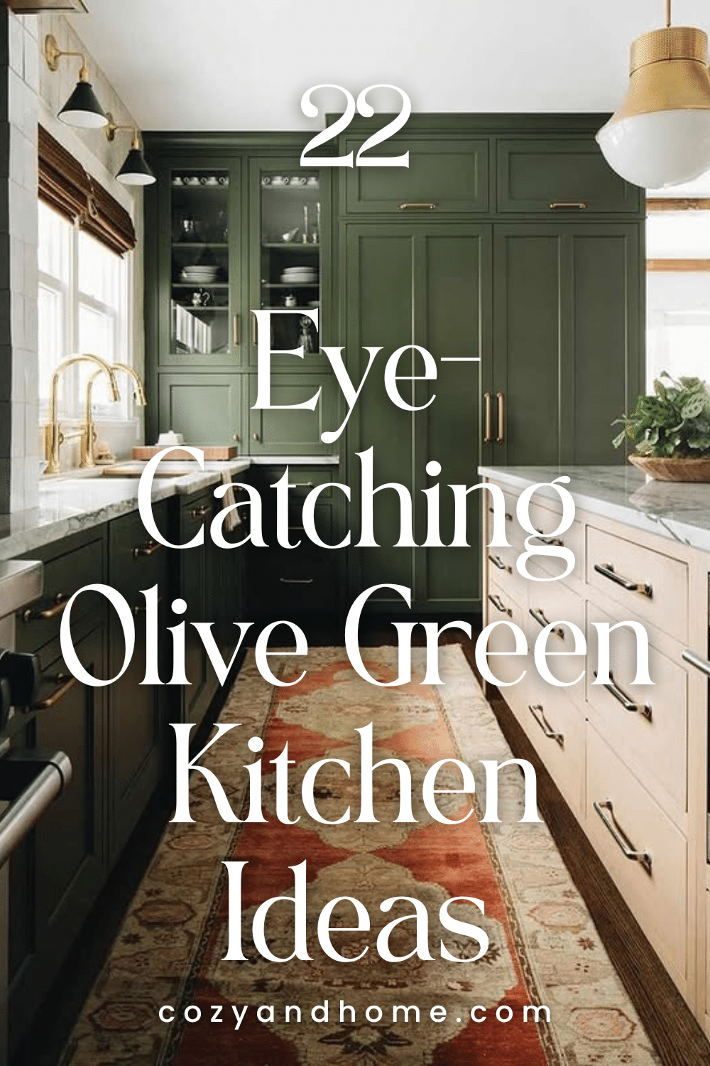 Olive green cabinetry lines both sides of this galley kitchen, complemented by light countertops and a patterned runner. Brass fixtures and layered textures keep the space inviting despite its compact footprint.