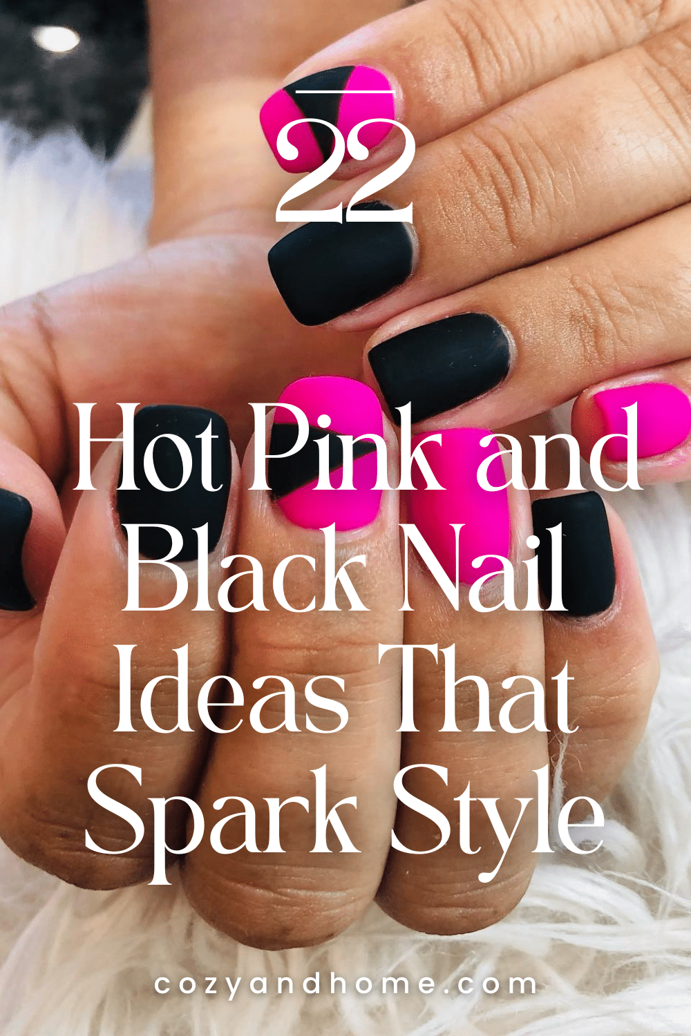 A combination of matte black, glossy pink, and shimmering foil accents. The blend of textures creates depth and variety while staying chic and bold.