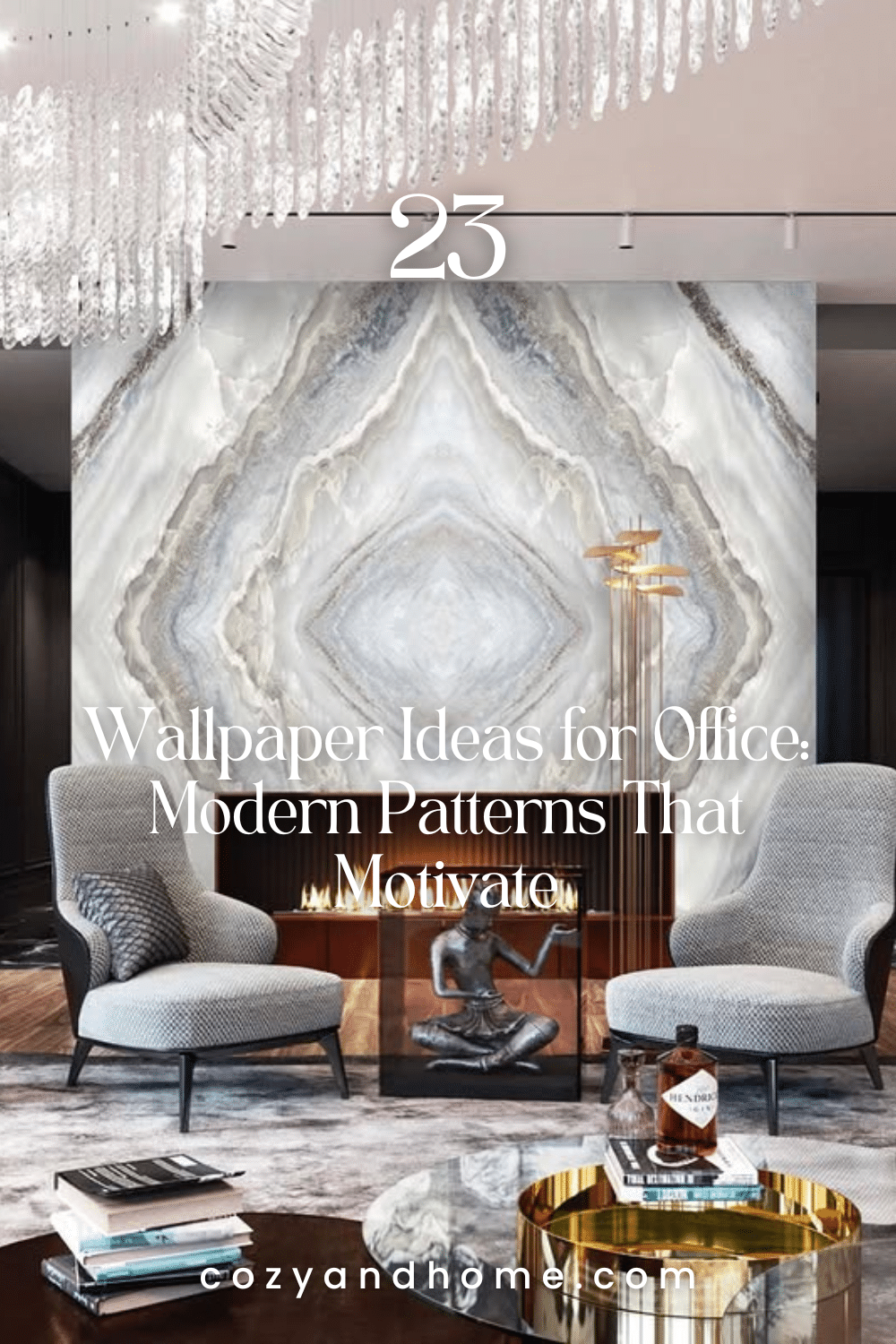 A stunning showcase of refined luxury, this design centers on a statement marble-effect wall that radiates elegance. Paired with plush seating, a modern fireplace, and metallic details, it exudes confidence and sophistication. The space invites meaningful conversations and moments of reflection amid its polished allure.