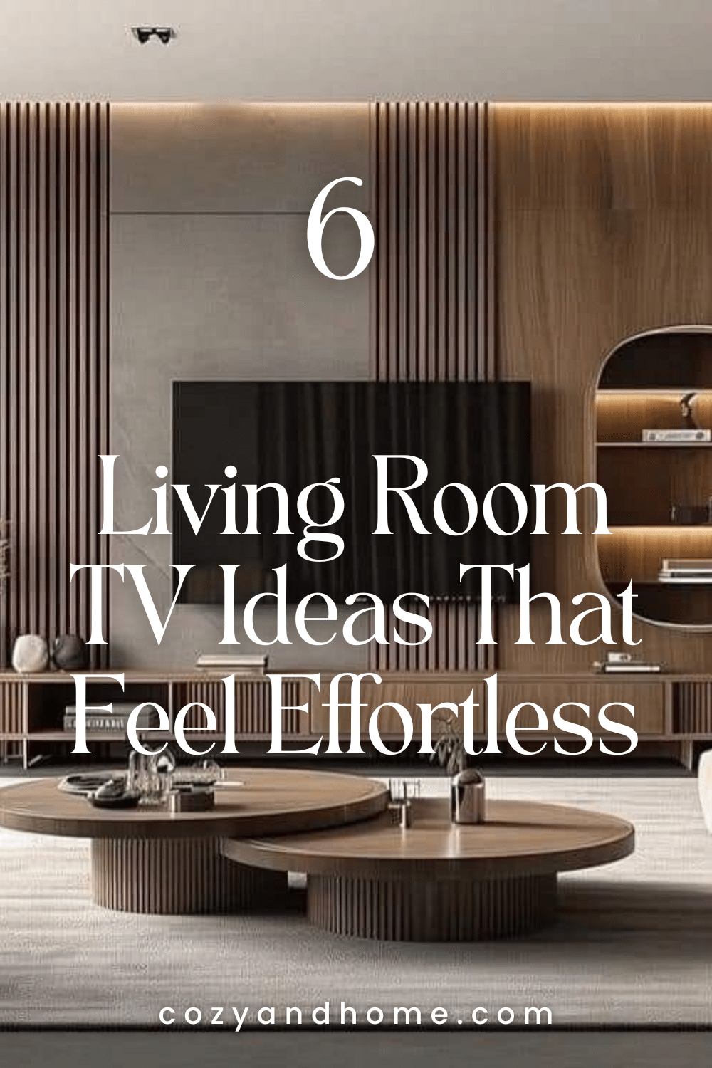 A balanced approach where wood slat detailing frames the TV, paired with a sleek floating console in wood and white. Subtle lighting softens the space, while the furniture layout encourages relaxation. The design reflects modern minimalism while maintaining a cozy undertone.