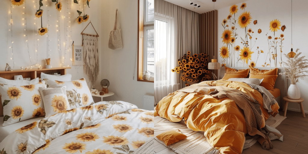 Sunflower bedrooms bring instant warmth and personality into your space 🌻There’s something powerful about golden petals against crisp white sheets