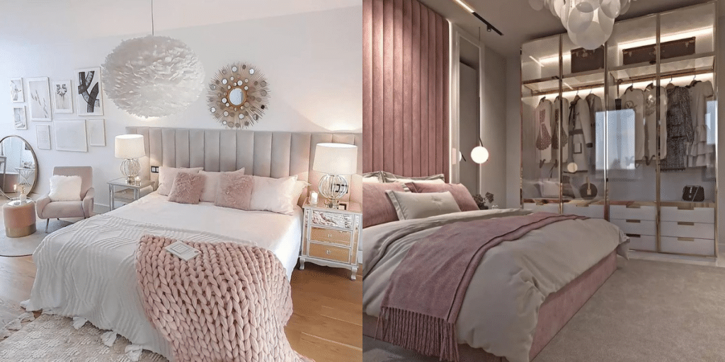 Pink and grey bedrooms strike the perfect balance between softness and sophistication. This color pairing blends gentle blush tones with