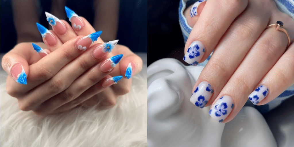 Blue flower nails are having a serious moment right now. 💙 Each design adds a fresh pop of color without
