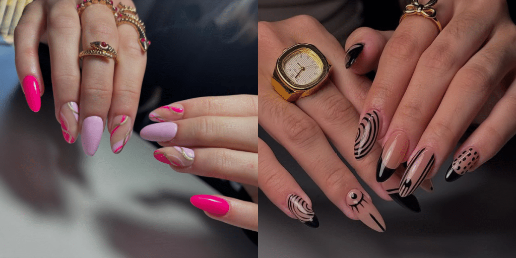 Clean lines, soft curves, and bold accents are taking over nail design right now ✨From minimal swirls to graphic stripes,