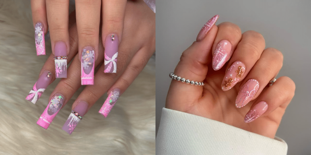 1. Frosted Pink Snowflake Coffin Nails Credit These nails feature a bright bubblegum pink French tip with sharp coffin shaping
